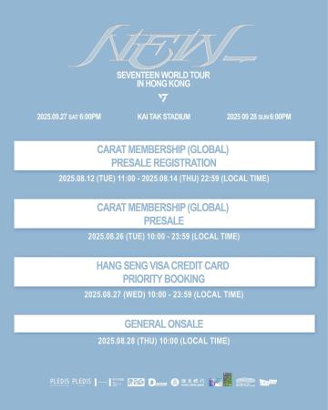 門票於即日起至8月14日晚上10時59分,接受於Weverse Shop上購買CARAT Membership(GLOBAL)的會員優先登記,成功登記後可於8月26日上午10時至晚上11時59分優先購票。隨後一日接受恒生Visa信用卡用戶優先購票,門票將於8月28日上午10時起透過Cityline公開發售。Now.com將為大家繼續帶來巡演的最新資訊,CARAT們記得鎖定Now.com!