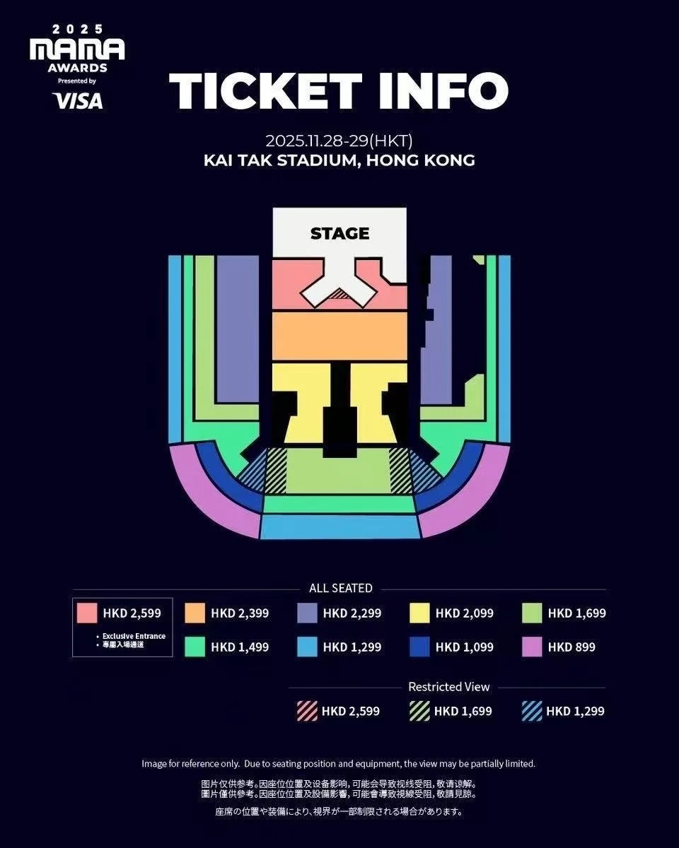 MAMA頒獎禮門票現已公開發售,價格分為$2,599、$2,299、$2,099、$1,699、$1,499、$1,299、$1,099及$899共八個等級。無法親臨現場的粉絲也可透過Now TV(tvN頻道155)收看直播,同步支持偶像們 !