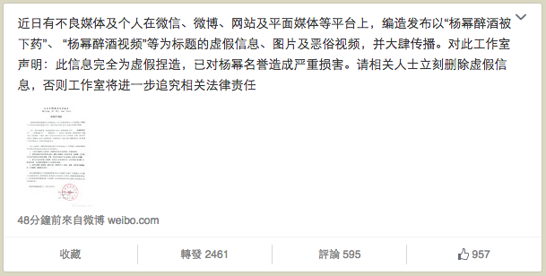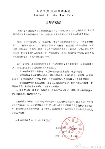 該聲明指,網上流傳的影片內容全是虛假及偽造,有關人士須停止侵權以及刪除影片。聲明中亦提到短片已為楊冪帶來極大的精神傷害,要求有關人士向楊冪公開道歉。