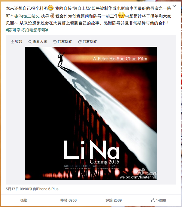 【now.com】中國網球壇的傳奇人物李娜,曾勇奪2011年法網和2014澳網大滿貫女單網球冠軍,成為歷史上第一位排名達到世界第二的亞洲球員。日前有報道指阿里巴巴影業準備投資約1億5千萬港元,製作以李娜的自傳《獨自上場》改編而成的電影《李娜》,並由香港導演陳可辛執導,預計出年年初開拍。這確是一齣令人期待的電影,李娜成功背後的故事充滿戲劇性︰如何在國內打出名堂,為何中途暫別回歸校園,數年後在一片意見聲中,選擇離開中國國家隊走上自負盈虧的職業路,最後如何逐步登上大滿貫之路,然後退役組織幸福家庭。一部完整的劇本其實已經在手,要拍得難看應該比拿大滿貫更難,不過能否拍出李娜真實的一面就是另一課題。