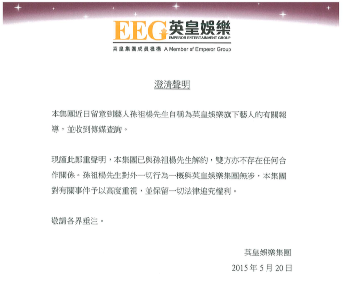 兩人其後接受內地傳媒訪問時,Calvin自稱為香港英皇旗下藝人,其微博簡介一欄同樣寫上「香港英皇藝人」。據知他的確在六年前左右與英皇簽約,但未曾約滿就被解約。故此舉觸怒了英皇,昨日特地發出聲明表示與Calvin再沒任何合作關係,冒認為英皇旗下藝人的話會保留法律追究權利。