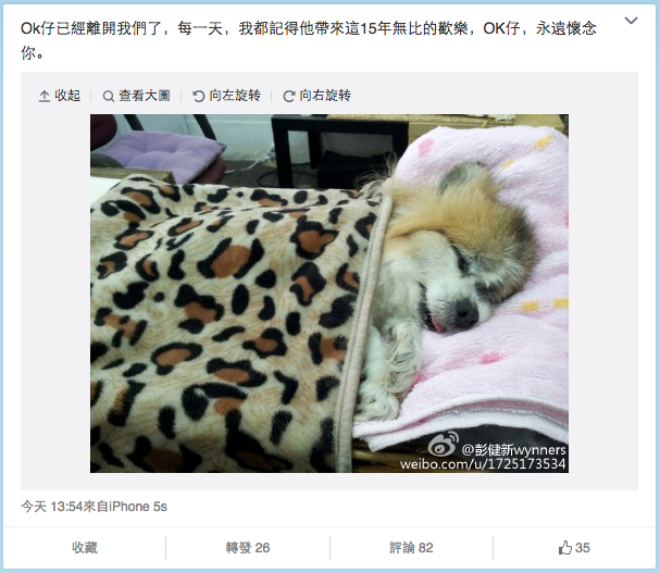 【now.com】「彭健新」三個字,大家除了會聯想起「溫拿」,相信亦一定會想起他的愛犬「OK仔」。彭健新是愛犬之人,出出入入都帶著OK仔,所以牠亦經常上電視,更試過拍廣告。不過,今日下午傳出噩耗, 彭健新於微博公布了OK仔的死訊,牠享年15歲。