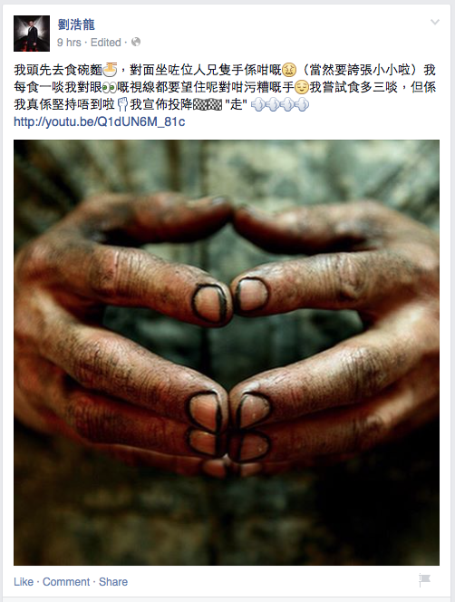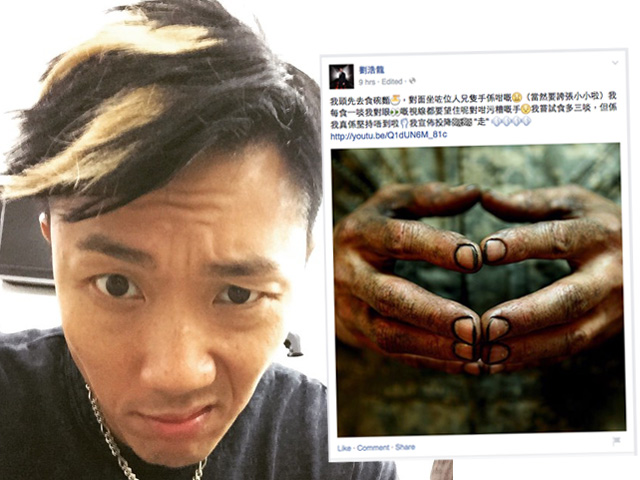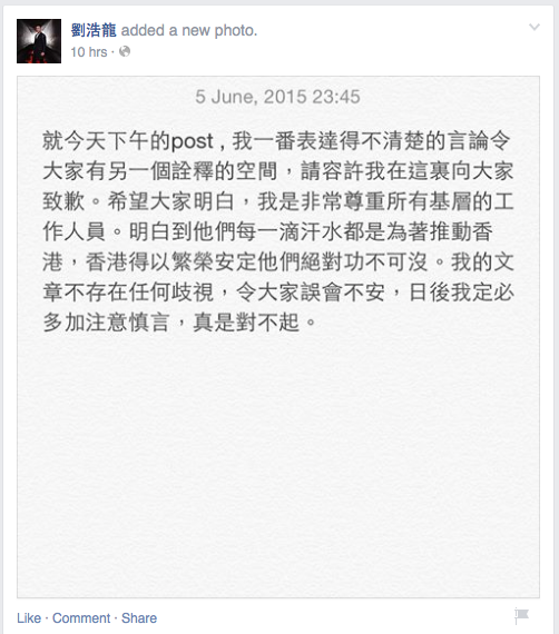 劉浩龍「污糟論」被圍插 師兄刪文兼道歉 劉浩龍「污糟論」被圍插 師兄刪文兼道歉 2015年6月6日 19:00 【now.com】劉浩龍昨日下午於社交平台上載一幅髒手照並發表了一篇「污糟論」,自言用餐的時候看到對面的食客一雙髒手而堅持不了,被迫「走人」。言論被圍插,網民紛紛指劉浩龍不懂得尊重別人、歧視勞動階層等等,更有留言指辛勞工作的人比他食軟飯、靠女友容祖兒高尚。 晚上,劉浩龍出席活動時為言論道歉,指大家誤解了,辯稱自己因有潔癖才會如此敏感。至晚上12:00時,他終於刪除相片並公開道歉。 劉浩龍的言論被網民鬧爆。(Facebook載圖) 晚上劉浩龍刪去相片又為言論公開道歉。(Facebook載圖) 而咁爆的言論亦即時被人抽水。(Facebook載圖)