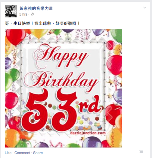 家強在Facebook上載一張印有「Happy Birthday 53rd」字樣的相片,並於上面寫道「哥,生日快樂!我出碟啦,好唔好聽呀!」,告訴哥哥自己的音樂成就。黃貫中就在微博上寫「因為你離去的惋惜,更要紀念你來臨的可貴 ,生日快樂 !」直表自己思念之情。葉世榮亦送上生日祝福,又指會延續家駒的愛心。