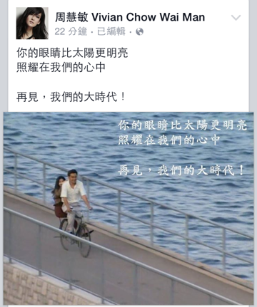 【now.com】無綫經典劇集《大時代》於日前深夜播出第40集大結局,不少藝人都紛紛於網上盡訴對此劇的不捨之情。在《大時代》中飾演「慳妹」的周慧敏,自星期五晚在結局播出前數小時在facebook留言「今晚要和大家一起看大結局」後,昨晚再度上載「慳妹」與「方展博」劉青雲的電視截圖,並寫道:「你的眼睛比太陽更明亮,照耀在我們的心中。再見,我們的大時代!」可見《大時代》的餘波未了。有網民在周慧敏的facebook表示,不願相信慳妹在方展博懷中死去的結局,「一直同自己講最尾一幕慳妹只係瞓着咗」,亦有網民表示不捨得《大時代》完結,「好耐無呢種唔捨得套電視劇完嘅感覺」、「可以多二十集嗎?」。