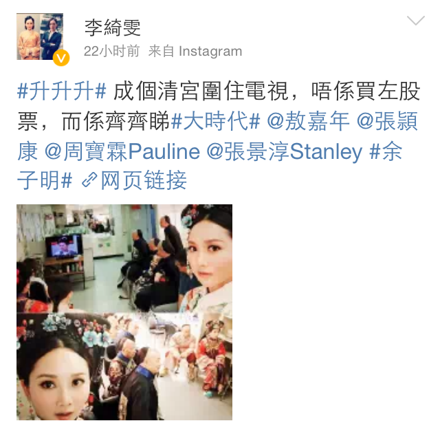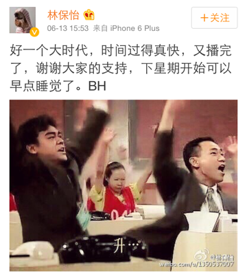 除了周慧敏之外,在《大時代》飾演股票經紀「陳滔滔」的林保怡,亦在微博留言:「好一個大時代,時間過得真快,又播完了......下星期開始可以早點睡覺了。」現正拍攝無綫清裝劇的李綺雯,也在微博分享與劇組敖嘉年、余子明等演員一起看劇的照片,並指:「成個清宮圍住電視,唔係買左股票,而係齊齊睇《大時代》。」歌手藍奕邦都在微博上載慳妹在方展博懷中死去一幕的照片,寫上插曲歌詞並道:「我哭了。」