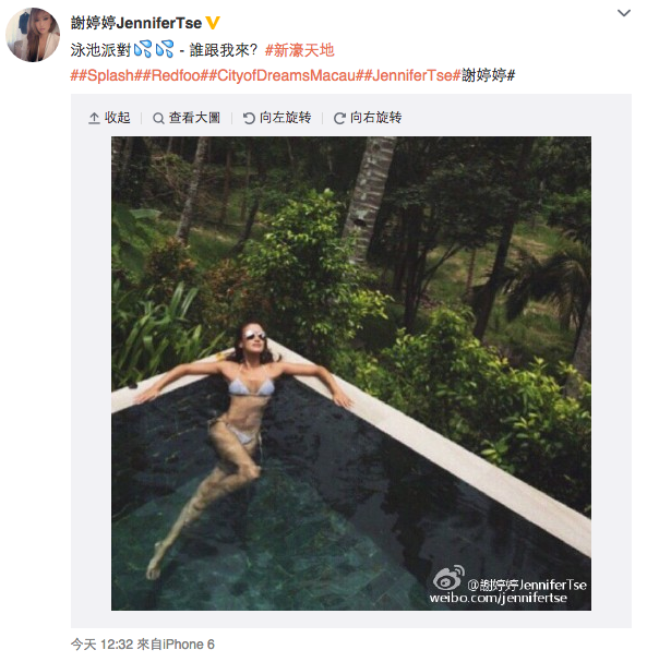 婷婷晒相之餘又在微博笑稱要開泳池派對。(微博截圖)