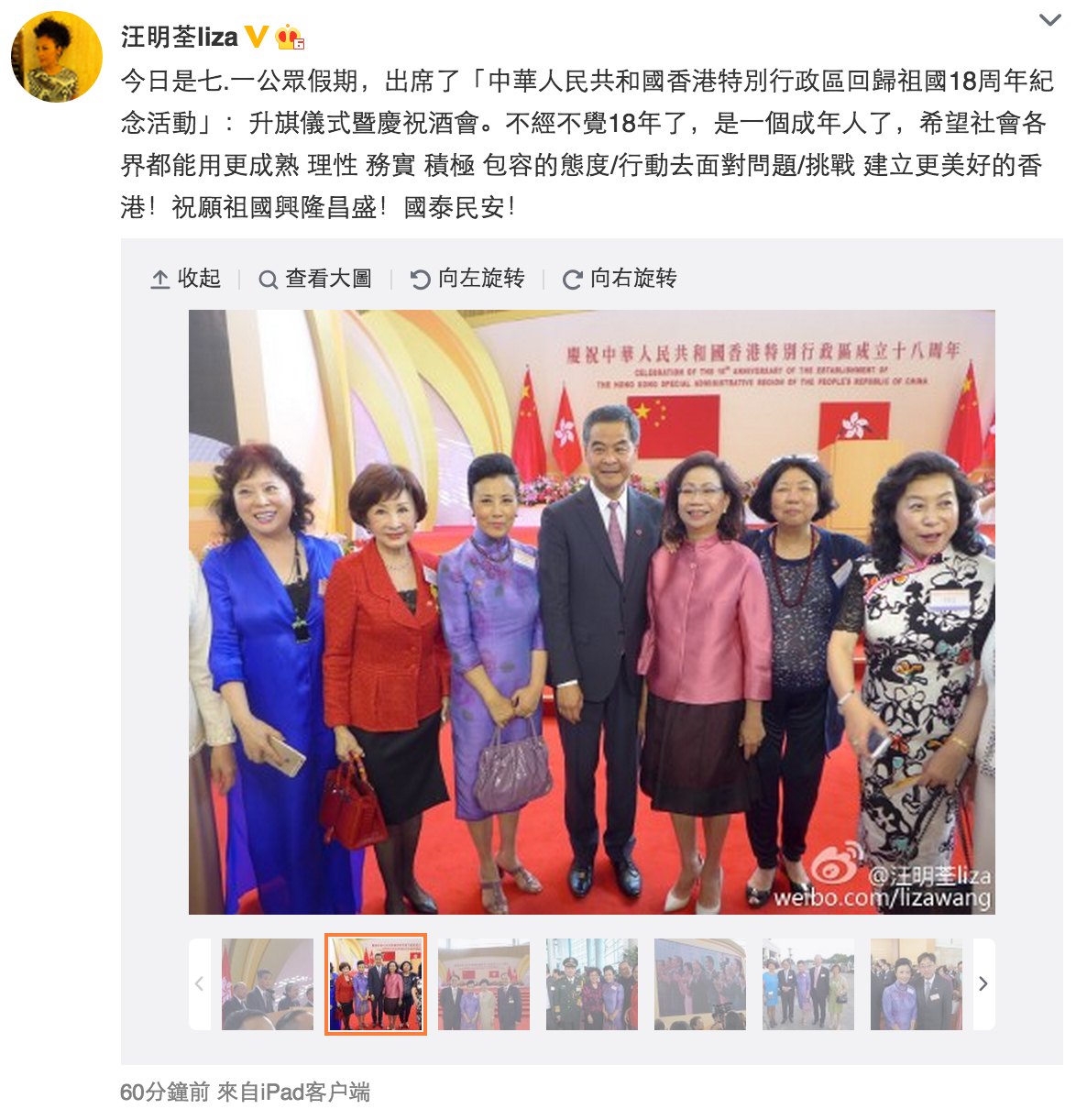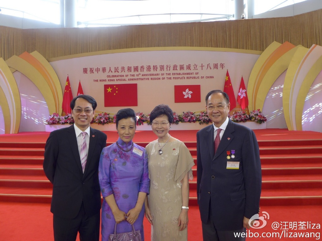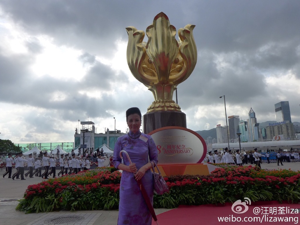 【now.com】今日是日7.1回歸紀念日,各界有不少慶祝活動,亦有七一大遊行。一向愛國愛港又身兼全國政協委員要職的汪明荃(阿姐),今日上午就出席了回歸升?儀式及慶祝酒會,活動過後,阿姐又與一眾政要名人,包括特首梁振英及太太梁唐青儀、政務司司長林鄭月娥等一齊合照,又放上微博與大家分享。身穿一身淺紫色旗袍阿姐,又在金紫荊廣場與銅像留影,更以成年人形容回歸18年的香港,她在微博寫道:「今日是七·一公眾假期,出席了『中華人民共和國香港特別行政區回歸祖國18周年紀念活動』:升旗儀式暨慶祝酒會。不經不覺18年了,是一個成年人了,希望社會各界都能用更成熟 理性 務實 積極 包容的態度/行動去面對問題/挑戰 建立更美好的香港!祝願祖國興隆昌盛!國泰民安!」