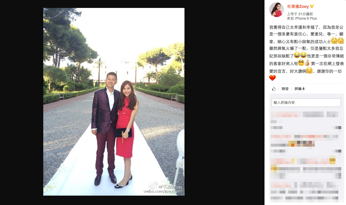 升呢做「闊太」的岑潔儀,專心湊仔,閒時只會做模特兒出席一下公開活動。舊愛陶喆下午開記招道歉,差不多同一時間,岑潔儀就在微博貼相發文,貼出多張與老公的合照,又話自己好幸福、好幸運,更大讚老公有好多優點,她說:「我覺得自己太幸運和幸福了,因為我老公是一個多麼有責任心,愛妻兒,專一,顧家,細心又有點小帥氣的成功人士。雖然脾氣火爆了一點,但是優點太多我忘記那些缺點了,他更是一個非常傳統的客家好男人呢!」岑潔儀又指自己是第一次在網上發表愛的宣言,話自己好大膽。有網友見到岑潔儀的發文之後,更留言說幸好當年沒有嫁陶喆。