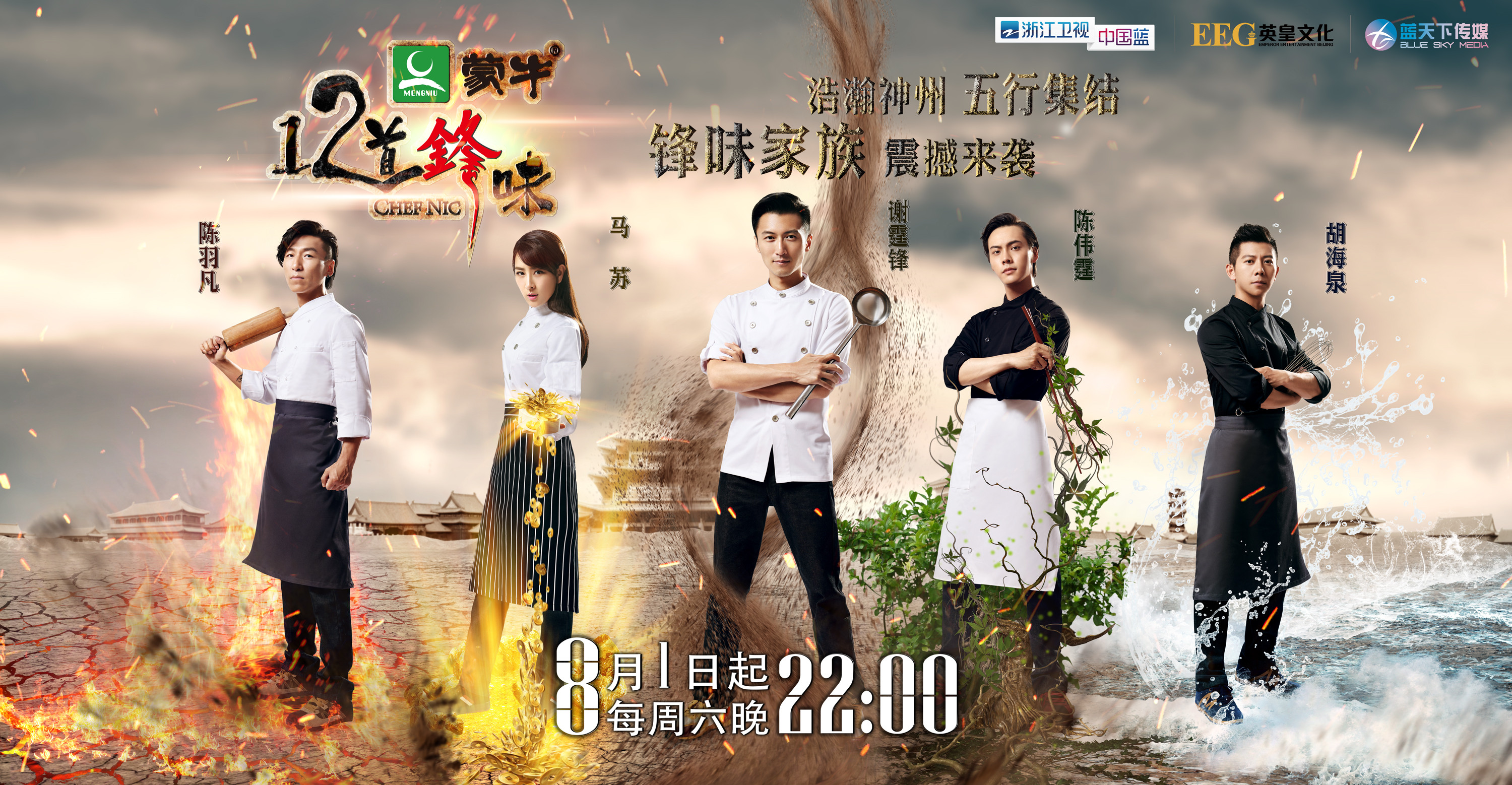 【now.com】謝霆鋒正努力趕拍《12道鋒味》第二季,上星期更在拍攝途中被大閘蟹箝傷手,以致要做小手術。第二季將於8月1日首播,有關方面剛剛公開以「五行」為主題的海報。霆鋒以「土」的姿態示人,聯同陳偉霆、組合羽泉的陳羽凡、胡海泉及內地女演員馬蘇挑戰十二個旅程,走遍中國,回歸中華傳統美食。