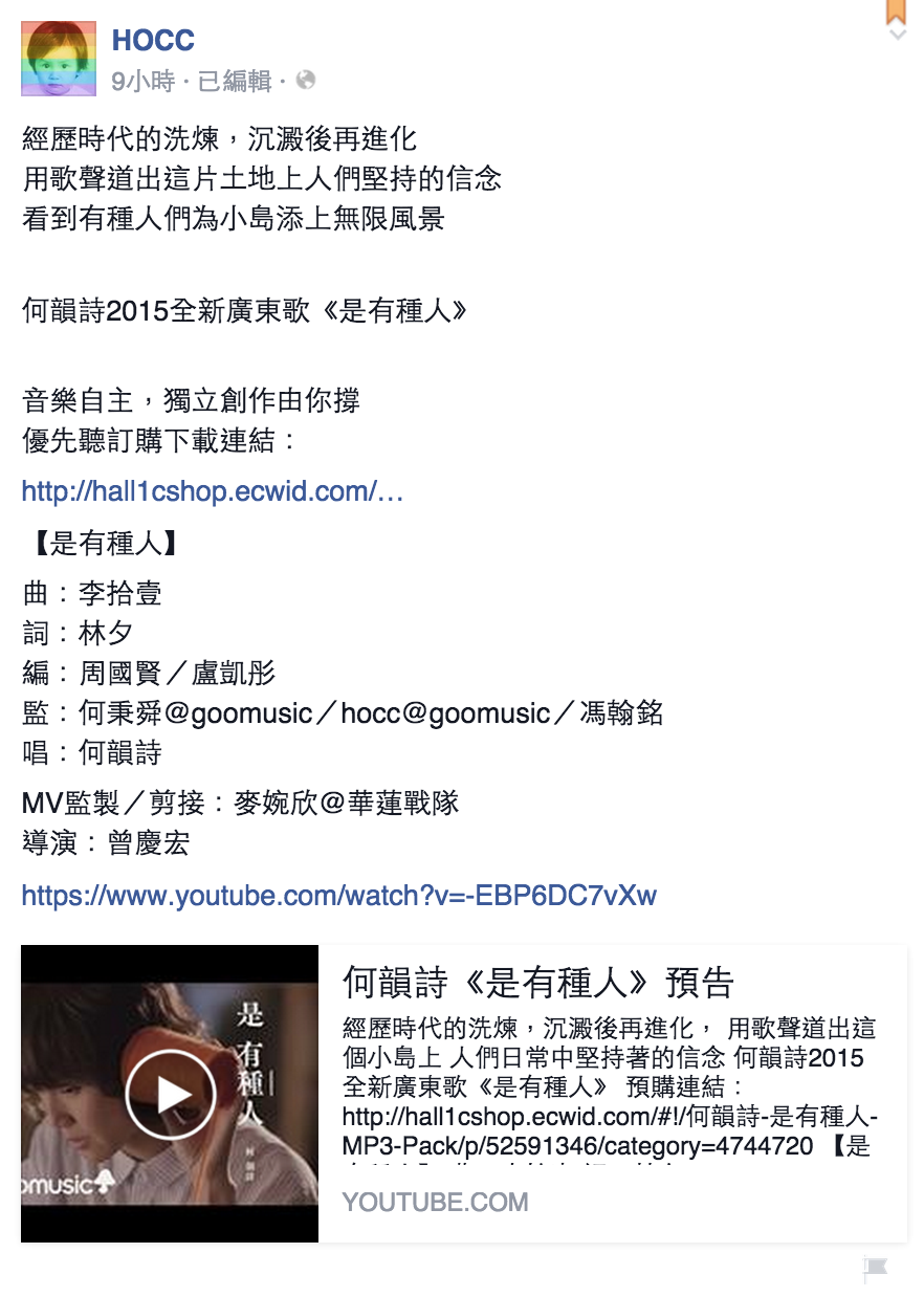 【now.com】何韻詩早前離開寰亞唱片,宣布做獨立歌手,日前更展開了「香港18種」的巡演計劃,目的要走訪香港18區。已經有一段時間沒有新歌的何韻詩,昨晚在Facebook放出新歌《是有種人》的預告片,片長34秒的新歌預告中,見盡不同行業階層的人。