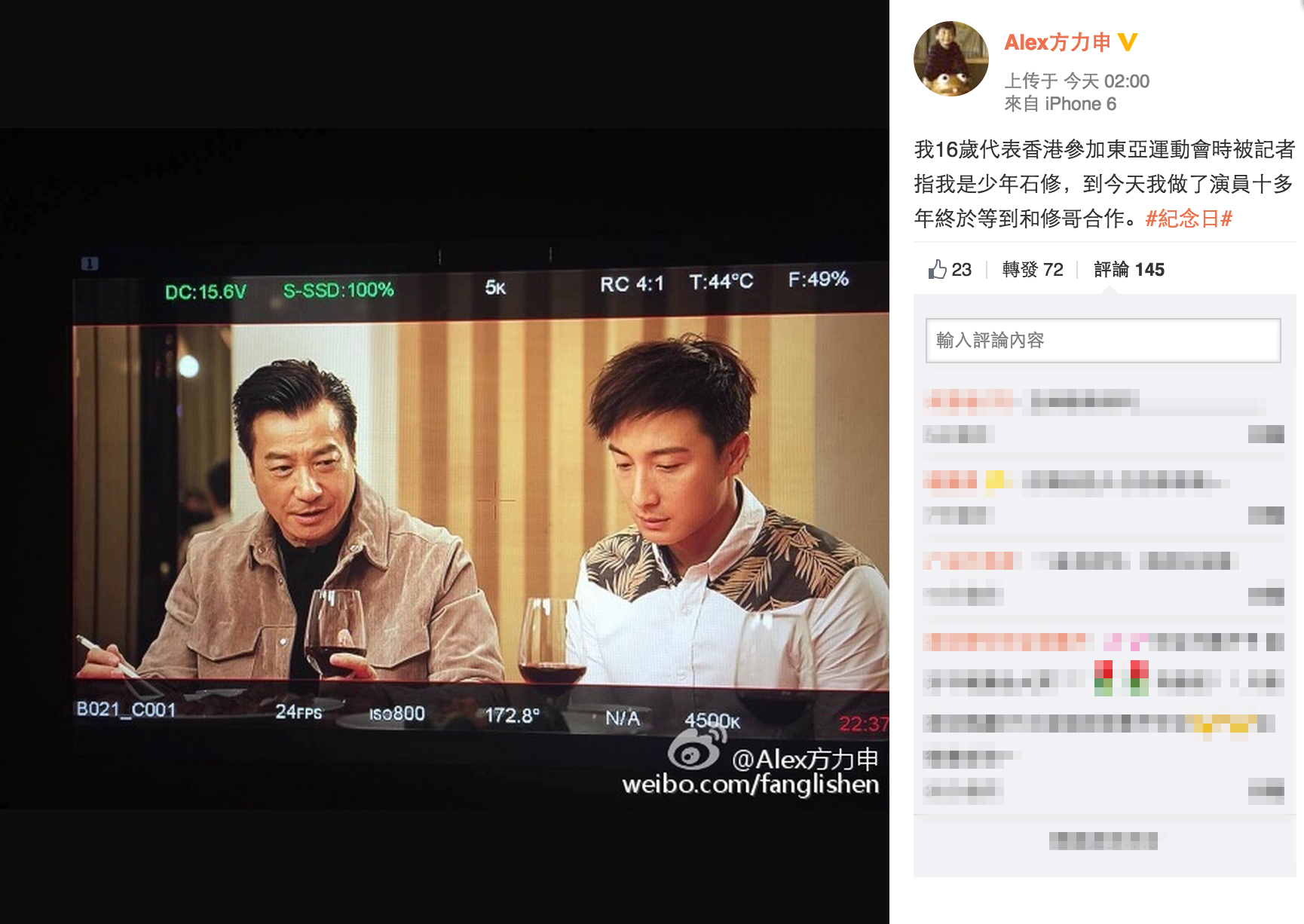 方力申孖石修晒激似樣側面照 方力申孖石修晒激似樣側面照 2015年8月1日 20:02 【now.com】方力申剛出道時曾經被歌迷話樣子似足石修,更笑指是石修兒子。兩人雖然都在演藝圈內工作,但鮮有見到兩人一起合作過。今日凌晨方力申在微博貼出他與石修一起合作拍攝新戲《紀念日》的相片,方力申又與石修齊齊影側面相,輪廓樣貌確實有幾分相似。方力申更對於兩人終於一起合作感到非常高興,又留言說:「我16歲代表香港參加東亞運動會時被記者指我是少年石修,到今天我做了演員十多年終於等到和修哥合作。」 方力申在微博貼出與石修的側面照,二人輪廓果真有幾分相似。(微博圖片) 方力申又在微博表示終於可以和石修合作感到高興。(微博截圖)