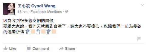 【now.com】泰國曼谷市中心四面佛附近昨晚發生爆炸,引致多人傷亡。日前在泰國度假的台灣藝人王心凌就馬上在Facebook報平安:「因為收到很多親友們的問候……要跟大家說,我昨天就回到台灣了,請大家不要擔心,也讓我們一起為曼谷的傷者祈禱」免得粉絲擔心。