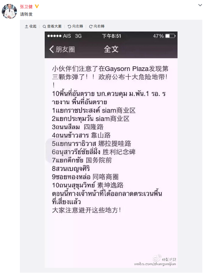 娛樂圈的藝人都非常關心爆炸事件,紛紛轉發有關消息。黃曉明及台灣藝人陳妍希就應內地有關部門之呼籲,轉發中國駐泰大使館電話。張衞健、江美儀、麥長青等藝人就呼籲身處曼谷而又懂泰語、普通話的朋友到醫院幫忙翻譯。