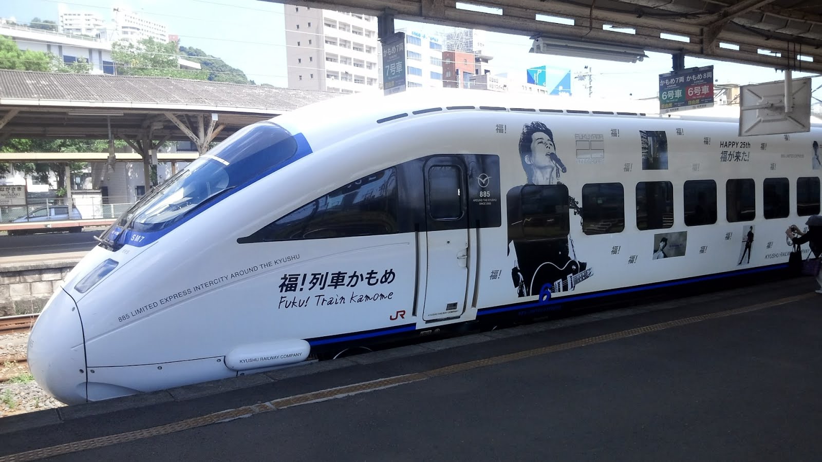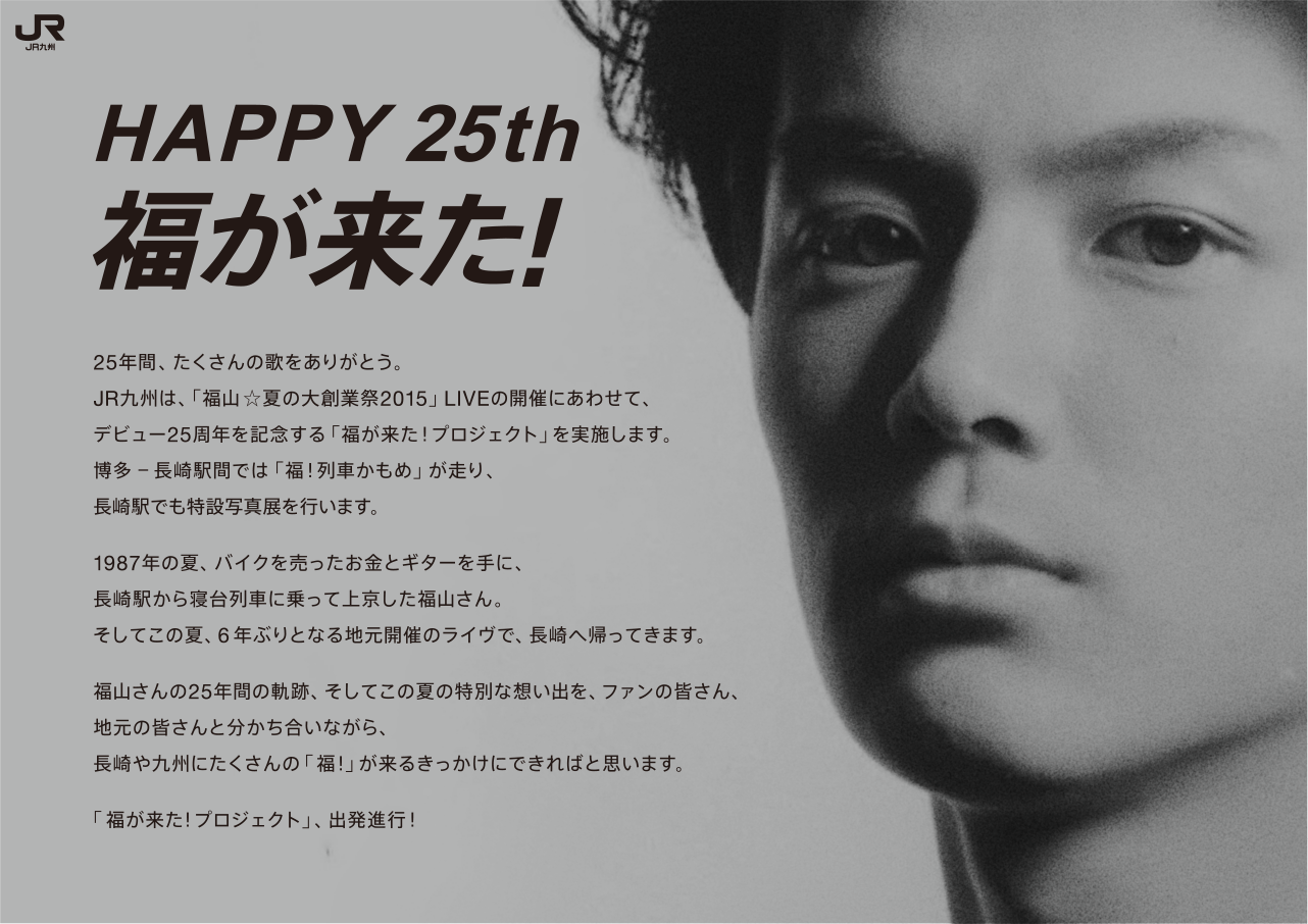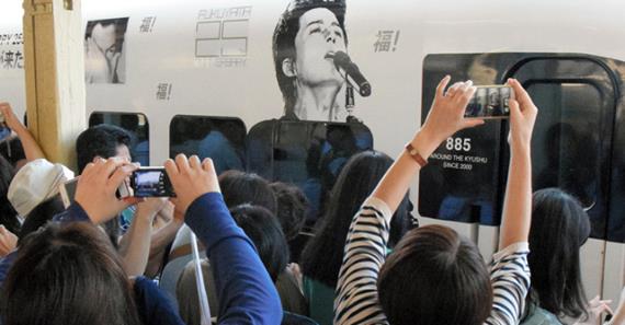 最近福山雅治更與JR九州合作,推出印有福山雅治頭像及相片的列車,遊走多個車站。而福山雅治的家鄉長崎市,其車站更有他的歌曲介紹。前日列車正式啟程,吸引大批Fans到場。列車特別之處除了特多靚仔相之外,乘客上落車時更聽到福山的歌聲。列車以期間限定形式行駛至10月16日。