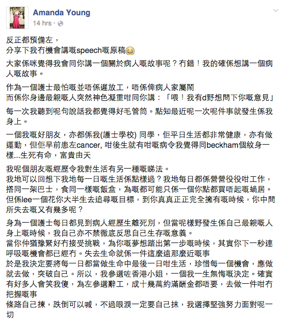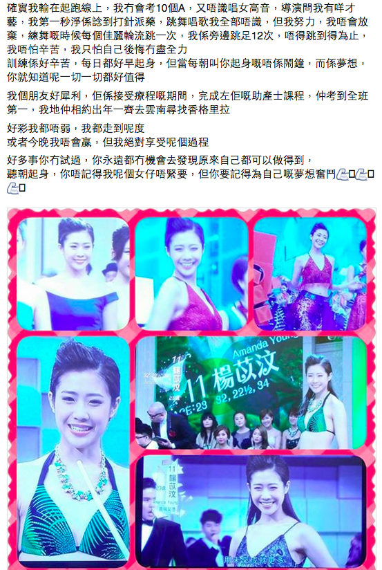 而11號落選佳麗楊苡汶昨夜在facebook打了一大篇文,她指是原先為了入選4強時會讀出的講稿,現在落選了唯有放上網講講感受。她先講述自己當護士的經歷,去到後半部分,她寫道:「確實我輸在起跑線上,我冇會考10個A,又唔識唱女高音,導演問我有咩才藝,我第一秒淨係諗到打針派藥,跳舞唱歌我全部唔識,但我努力,我唔會放棄。」擺明就是以十優生兼從小學習芭蕾舞、聲樂亦達八級的麥明詩做比喻。