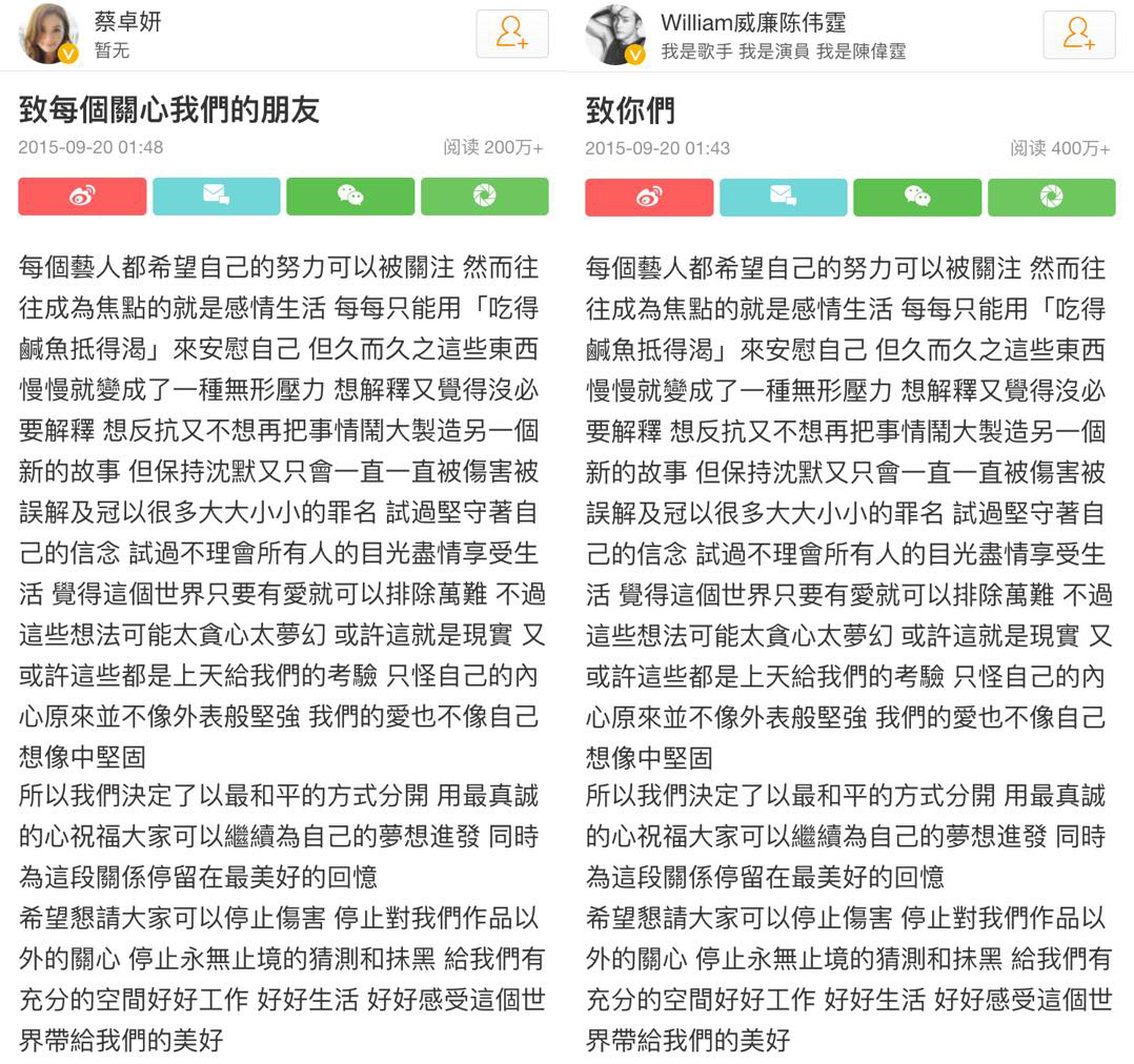 【now.com】陳偉霆(William)和蔡卓妍(阿Sa)早前宣布分手,結束5年情,更在微博發放分手聲明。有人話,扯,根本男的痴埋去就是想紅,現在紅了當然就飛你啦。即如果是真的話,比起看不起這種做法,我更詫異如此老土的招數,原來仲work!又看看大陸,很多人在討論,雖然這件事香港人不算太關心,但最重要是大陸fans叫好,叫好,William的網劇收視就有momentum上升,阿Sa年底的Twins 15周年演唱會亦有話題。愛情這回事真令人感慨,一齊固然開心,就算係分手,只要分得有計劃,原來真係會雙贏的。