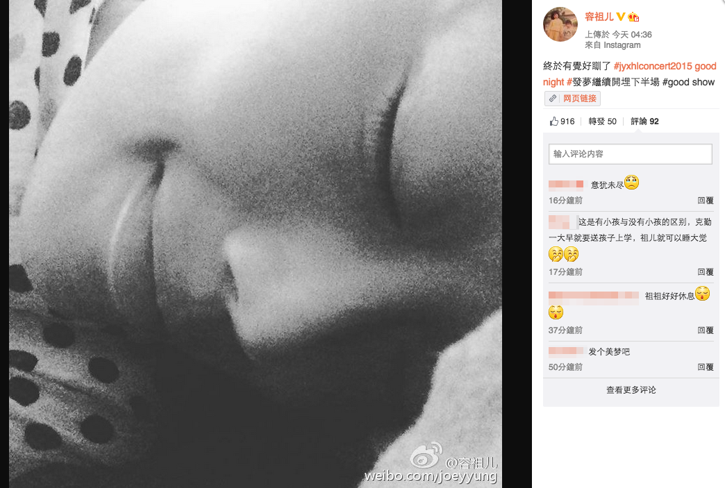 而容祖兒(Joey)就凌晨四點上傳相片話終於可以有覺好瞓,並且要發夢繼續開埋下半場。未知男朋友劉浩龍打算如何同Joey慶祝呢?