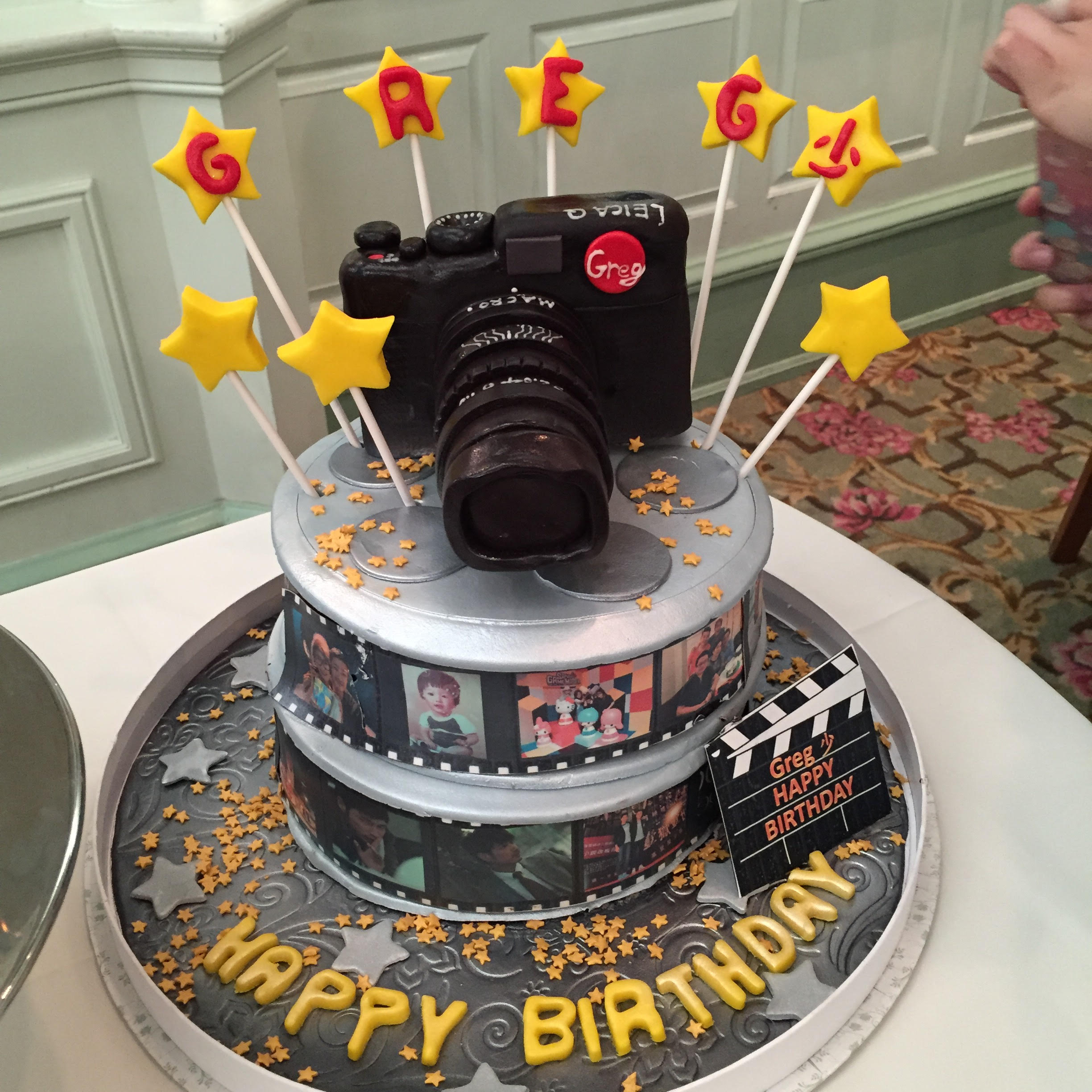 他們和一班朋友特別為王宗堯炮製了一個別出心裁、寫上「Greg少Happy Birthday」的攝影機生日cake,蛋糕底部有他和親友同事們的合照,又有他和周家怡拍《導火新聞線》時的照片、《選戰》劇照及《壹獄壹世界:高登闊少踎監日記》的宣傳活動相片等等,非常精美,加上現場又有米奇老鼠做特別嘉賓賀壽,難怪氹到壽星仔笑唔停。