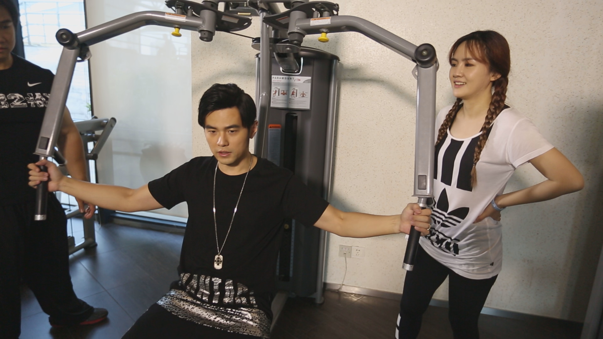 周杰倫出動自己的健身教練來教梓童(右)做力量練習。