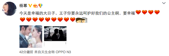 楊冪就在微博送上祝福。(微博截圖)