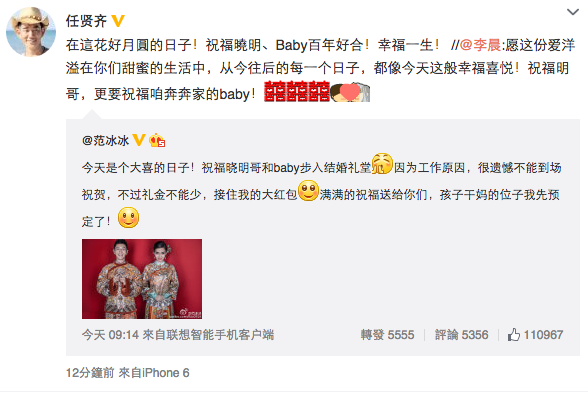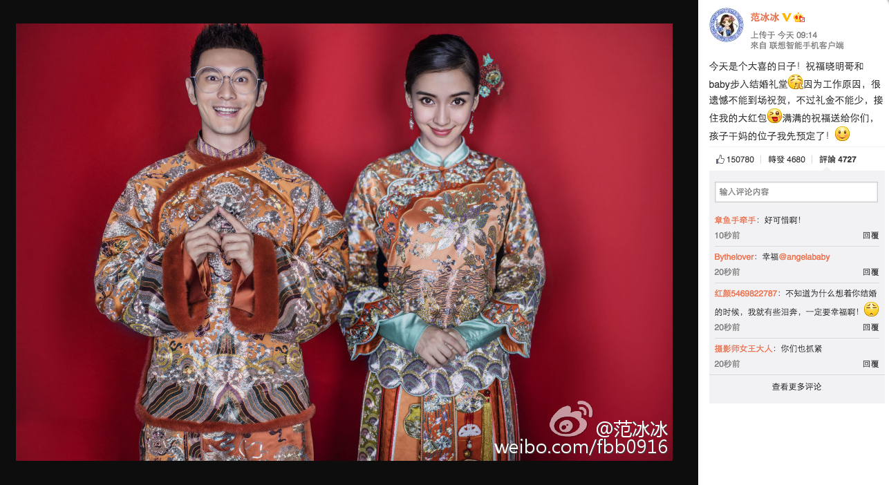 身為二人好友的范冰冰卻在微博話因工作缺席,非常掃興。(微博截圖)