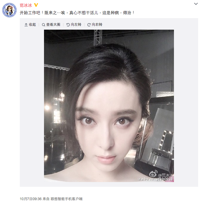 冰冰昨日已於微博表示忙於工作。(微博截圖)