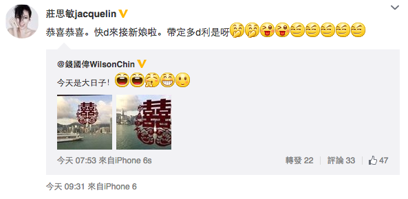 另外,同樣是今日與陳宛蔚拉埋天窗的導演錢國偉,一大班兄弟包括鄭伊健、錢嘉樂等今早齊齊出發接新娘。今早錢國偉更亦在微博留言表示「今天是大日子!」又上載了貼有「囍」字的窗花圖片,認真開心!