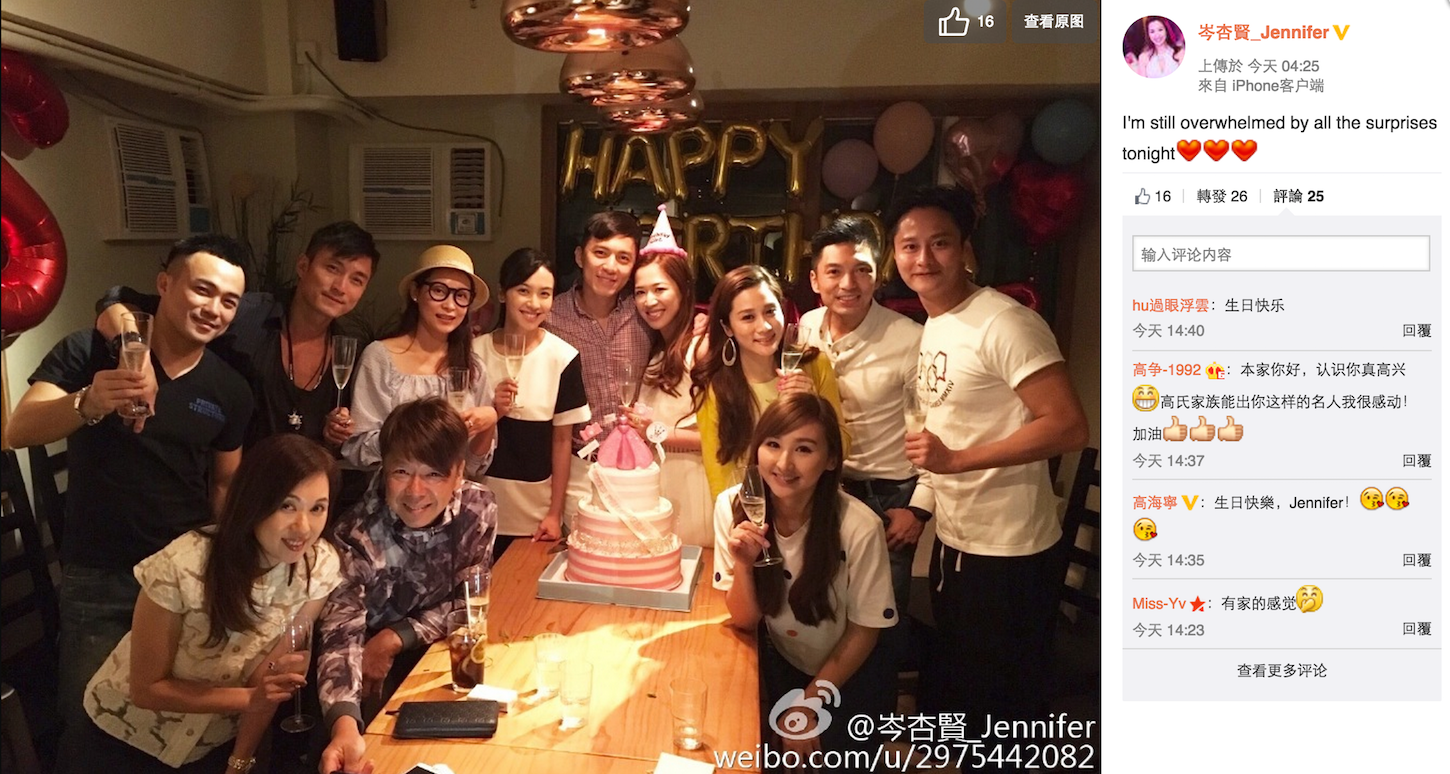 【now.com】十月有好多藝人生日,一夜之間突然有好多生日慶祝相出現。先有昨日27歲生日的2012年港姐岑杏賢(Jennifer),除了好姊妹朱千雪、楊卓娜、張嘉兒同高海寧之外,男友袁偉豪當然都有出席。Jennifer收到一個三層蛋糕,上面更有大大個港姐標誌,看來都是袁偉豪的主意吧!難怪Jennifer攬實袁偉豪影相喇!