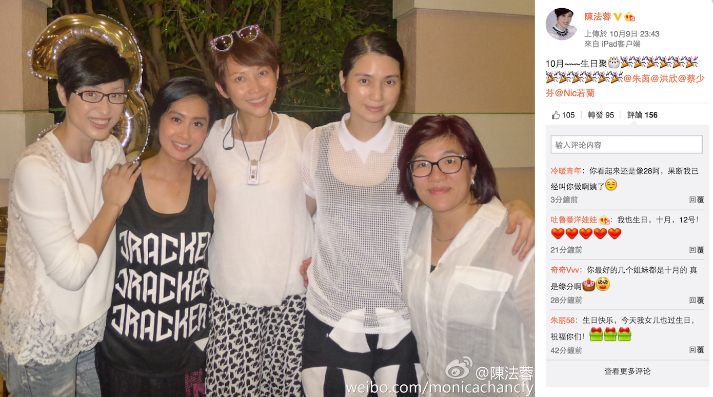 同日仲有陳法蓉(28/10生日)、朱茵(25/10生日)及洪欣(9/10生日)開十月壽星生日會,她們更補祝蔡少芬的九月生日,果然係好姊妹。一班女神都淡妝現身,不過風采依然。她們又請到迷你兵團……氣球出席,陳法蓉開心到不斷集郵,更向特大迷你兵獻吻。