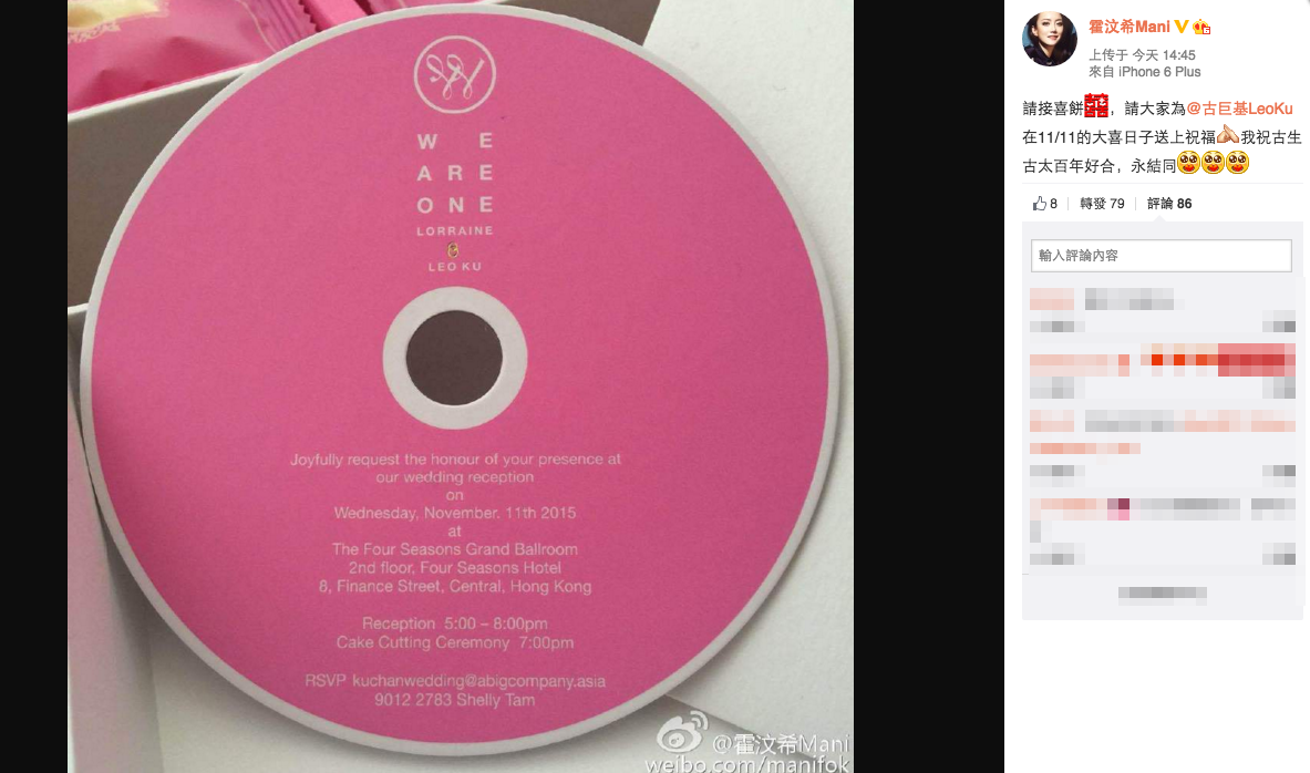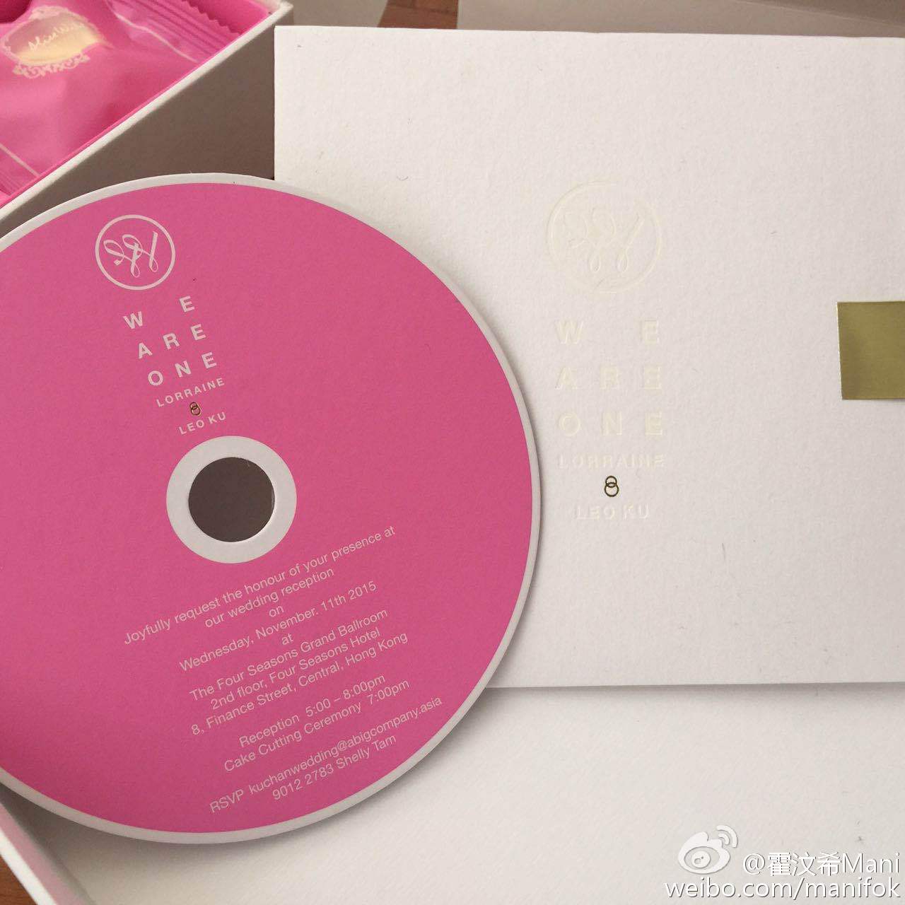 喜帖外型猶如一隻CD,婚宴會在中環四季酒店舉行。(微博圖片)