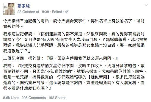而最易估是因為,你未開始估,傳媒已出茅招搵定幾個女仔問回應。這個手法,25年未變過,全香港或全台灣幾百個女星,一開始只集中問5、6個,那其實已經是一種不負責任的表態了,不是說一定是那幾個女仔,而是這樣問一問,任誰都水洗唔清。又咬佢唔入,嗱,我冇爆係邊個邊個呀,你自己聰明估到咋!