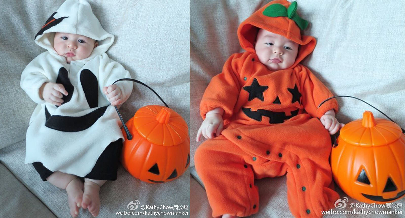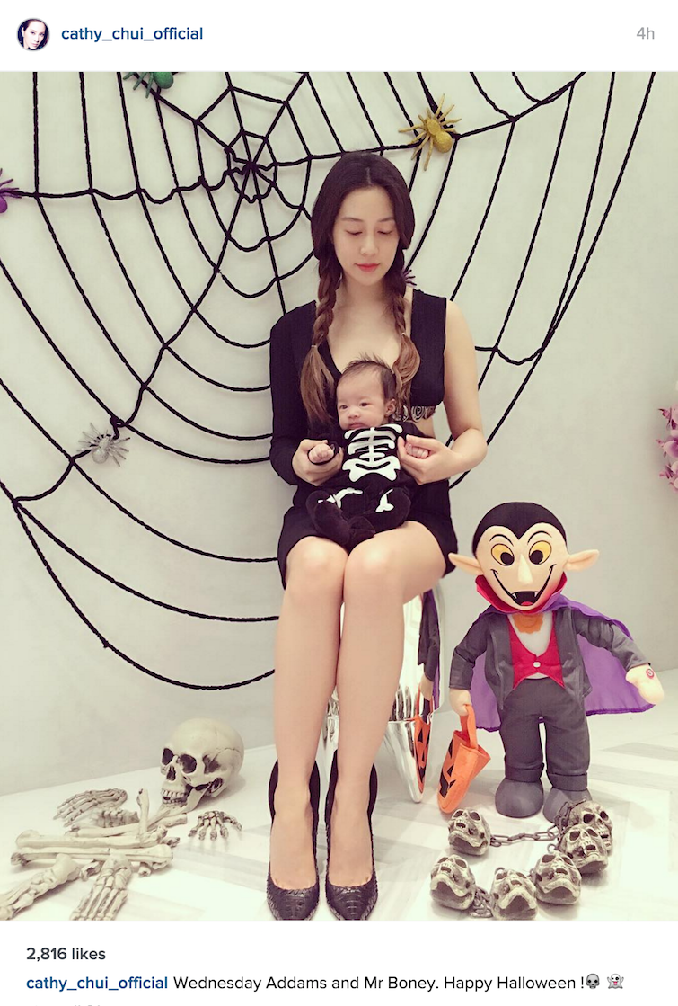 【now.com】呢幾年真係有好多藝人生小朋友,所以萬聖節這些要扮鬼扮馬的節日,我們都特別多靚相睇。名模周汶錡(Kathy)就為3個多月大的囝囝Jacques穿上兩套萬聖節衫仔,扮完嘩鬼再扮南瓜仔,配合Jacques的無辜樣子,實在萌倒不少網民。「千億新抱」徐子淇(Cathy)就同孻仔李建熹齊齊以愛登士家庭造型現身,靚媽原來已經極速修身,紮起孖辮並著上短裙晒長腿扮的Wednesday Addams,非常性感,而囝囝就穿上骷髏骨衫扮Mr Boney。
