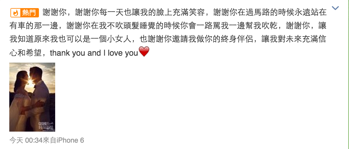 今早凌晨12時半,杏兒上載和Philip的婚照,並寫下愛的宣言:「謝謝你,謝謝你每一天也讓我的臉上充滿笑容,謝謝你在過馬路的時候永遠站在有車的那一邊,謝謝你在我不吹頭髮睡覺的時候你會一路罵我一邊幫我吹乾,謝謝你,讓我知道原來我也可以是一個小女人,也謝謝你邀請我做你的終身伴侶,讓我對未來充滿信心和希望,thank you and I love you」