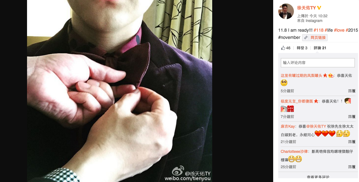 【now.com】男子組合Shine成員徐天佑今日與圈外女友Olive結婚,今早天佑就在社交網站晒出打煲呔相片,又露了少少下巴,仍然難掩新郎哥的喜悅,又留言寫上:「11.8 I am ready!!!」Fans見到都紛紛留言送上祝福。