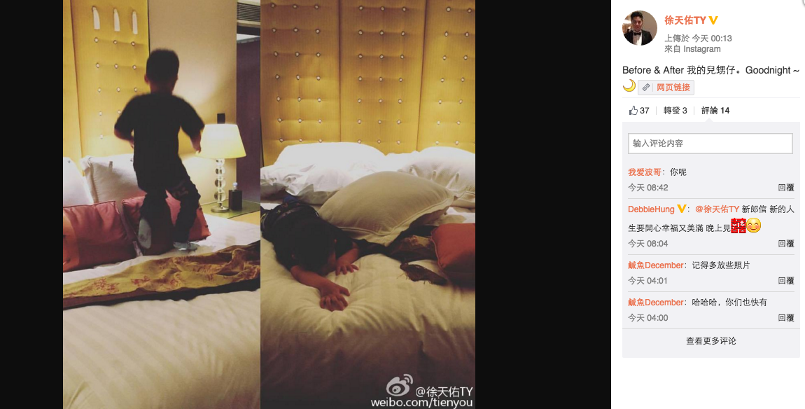 凌晨時分,天佑貼出同兒甥仔玩的相片。(微博截圖)