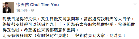 天佑昨晚在Facebook留言,話婚禮已經準備好。(Facebook截圖)