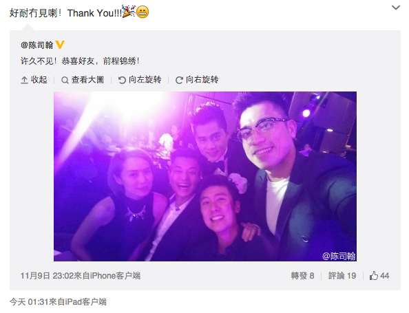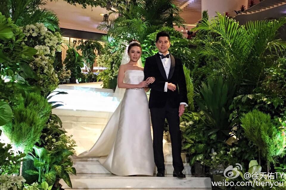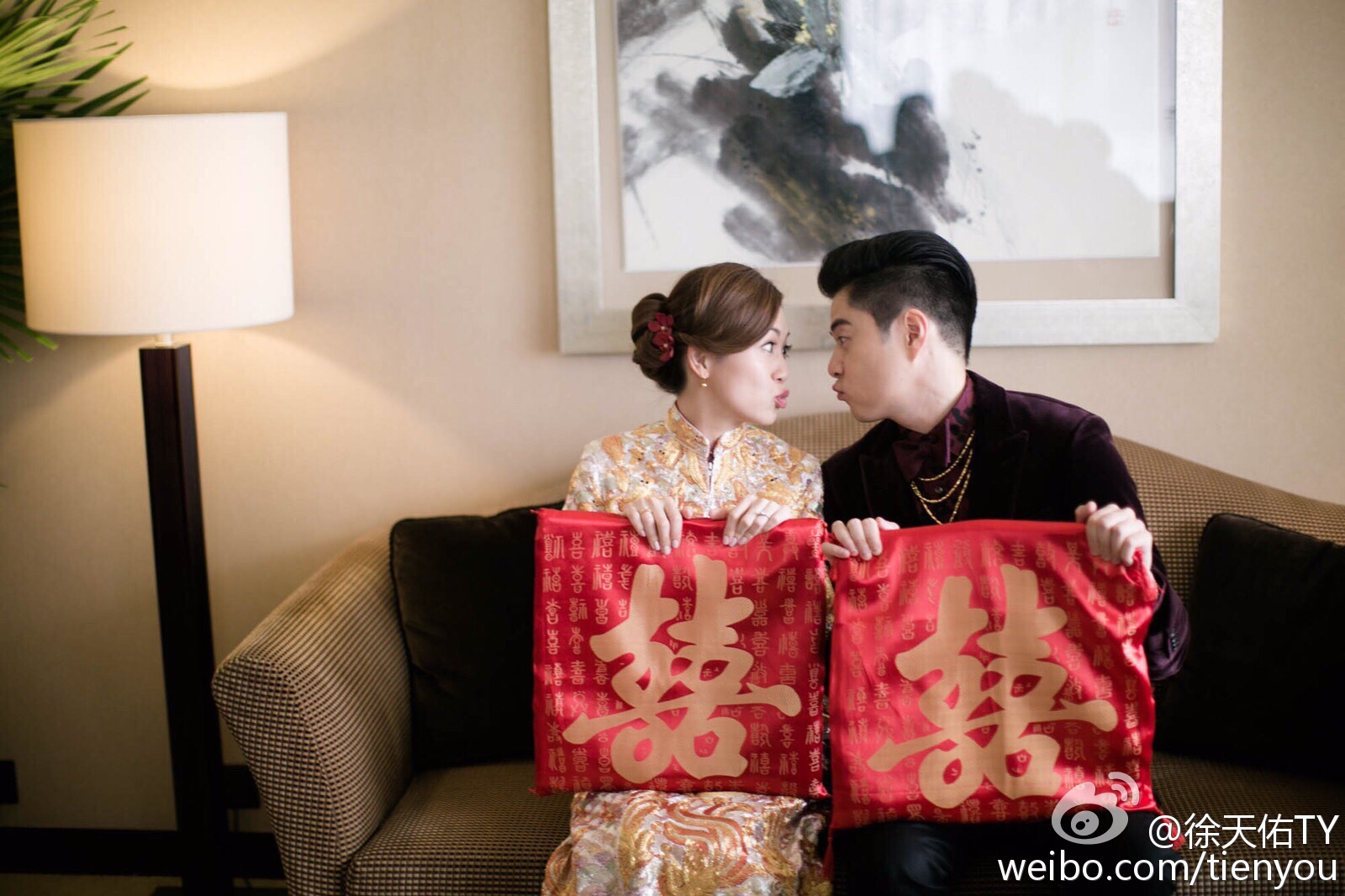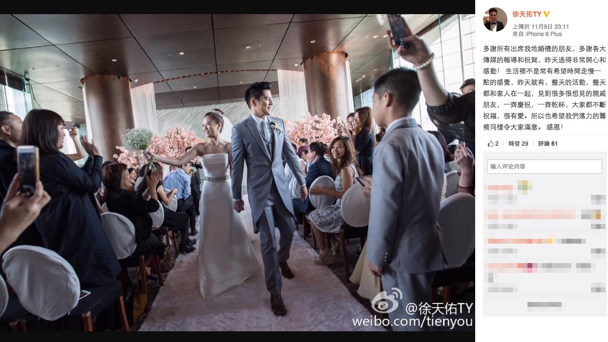 【now.com】組合Shine的徐天佑前日大婚,筵開40席,大批圈中好友出席。婚禮過後,「升呢」做人夫的天佑,昨晚在微博發文向親友道謝,又貼上當日的婚禮圖片,其中一張更見到天佑同老婆Olive鬥雞眼嘟咀對望,非常搞笑,天佑留言說:「多謝所有出席我地婚禮的朋友,多謝各大傳媒的報道和祝賀,昨天(11月8日)過得非常開心和感動! 生活裡不是常有希望時間走慢一點的感覺,昨天(11月8日)就有,整天的活動,整天都和家人在一起,見到很多很想見的親戚朋友,一齊慶祝,一齊乾杯,大家都不斷祝福,很有愛。所以也希望我們落力的籌備同樣令大家滿意。 感恩!」