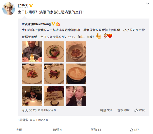 同屬Beyond的葉世榮就準時12點喺微博祝家強生日快樂,,而與家強不和的黃貫中則未有表示。最近一齊以「男人幫」身分,同家強周圍開演唱會嘅任賢齊、蘇永康都有轉載相片祝賀,小齊仲形容「浪漫的家強過了個超浪漫的生日」。