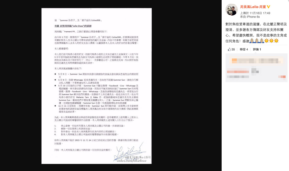周美鳳昨日就發聲明,澄清自己並非事件主角。(微博截圖)