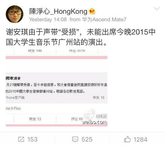謝安琪(Kay)因「佔中」時曾發送物資亦被列在追擊之藝人名單中,恰巧昨日她因聲帶受損而缺席2015中國大學生音樂節廣州站,陳淨心就轉發該資訊,並指:「謝安琪由於『聲帶受損』,未能出席今晚2015中國大學生音樂節廣州站的演出。」好似暗示Kay稱病是假的,實質是因他們的追擊而被取消演出。Kay的微博及Facebook亦開始收到大量批評的留言:「食得咸魚抵得渴,認衰喇!」、「我們國內已把你抹掉」、「沒有國家就沒有你謝安琪」不過,面對負面評擊,Kay未有現身回應。