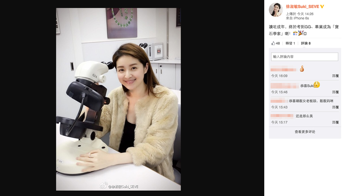 【now.com】港姐出身的徐淑敏(Suki),與丈夫黃浩(Kenny)結婚6年,生了3個囡囡,一家五口相當溫馨。Suki早前就曾經同囡囡一齊學豎琴,又話會問清楚小朋友喜不喜歡先,不會強迫。最近Suki又不斷增值,學多樣技能,她今日在微博上載了一張自己坐在顯微鏡前的相片,又興奮留言說:「讀咗成年,終於考到GG,畢業成為『寶石學家』喇!」留言提到的「GG」其實是研究寶石學家文憑,課程中會讀到鑽石分級、分辨有色鑽石等。今次Suki榮升做寶石學家,Fans都留言恭喜。