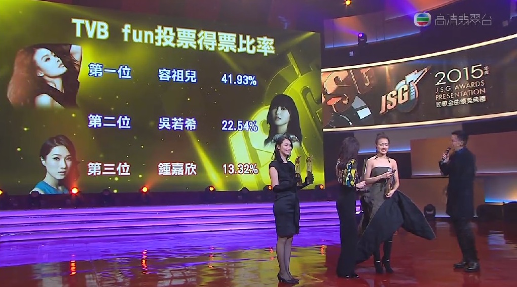 最臉不紅耳不熱的還是TVB,夠膽在這個揀無可揀的情況下扮民主搞全民投票,結果當場公布的女歌手最後三強分別是鍾嘉欣、吳若希和容祖兒。這個畫面實在令祖兒非常難堪,堂堂一位天后級歌手,跟一位半新丁和一位業餘歌手對壘,感覺有如奧運短跑冠軍,走到學界組別出戰,還要是小學雞組,叫人情何以堪?不單是女歌手,男歌手亦好不了多少,張敬軒的「最受歡迎男歌星」獎,是「擊敗」了許廷鏗和鄭俊弘而奪得,只可以講句,冇擺胡鴻鈞落去已經算留咗情面。