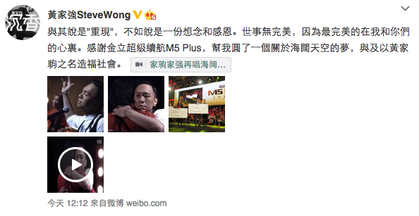 未知黃家強選擇看不到這些批評,還是不在意歌迷感受,他顯然沒將批評聲音放在心上,今日他在微博寫道:「與其說是"重現",不如說是一份想念和感恩。世事無完美,因為最完美的在我和你們的心裏。感謝金立超級續航M5 Plus,幫我圓了一個關於海闊天空的夢,與及以黃家駒之名造福社會。」