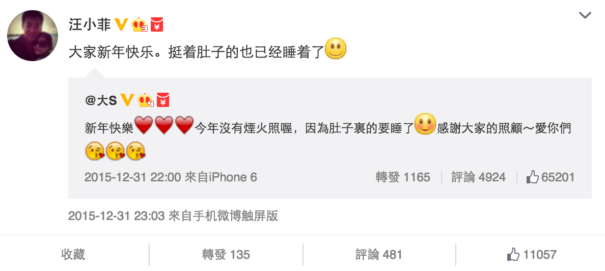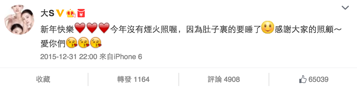 昨晚大S在微博發文,她說:「新年快樂!今年沒有煙火照喔,因為肚子裏的要睡了,感謝大家的照顧!」其實早於去年10月就已經有傳出大S再有身孕,不過迷信的大S就怕小氣而一直不承認。消息一出,網友都紛紛送上祝福,又希望她能一索得男,湊個「女子」字。及後,老公汪小菲都轉發她的發文,並透露「挺著肚子的也已經睡著了。」