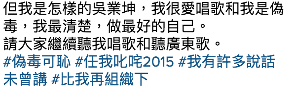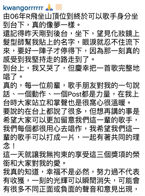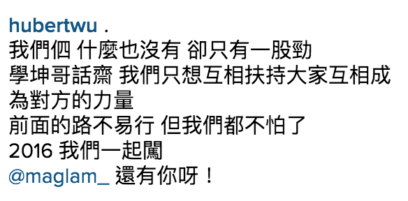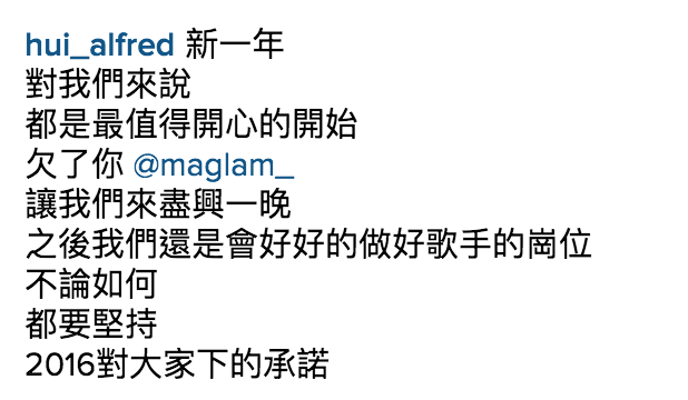許廷鏗就寫得感性少少,他說:「新一年,對我們來說,都是最值得開心的開始,欠了你Mag Lam,讓我們來盡興一晚,之後我們還是會好好的做好歌手的崗位,不論如何都要堅持,2016對大家下的承諾。」胡鴻鈞都冇忘記同樣是「巨聲幫」出身的林欣彤:「我們伵,甚麼也沒有,卻只有一股勁,學坤哥話齋,我們只想互相扶持大家互相成為對方的力量,前面的路不易行,但我們都不怕了 2016,我們一起闖,Mag Lam還有你呀!」希望大家都會記住想唱好歌呢份初衷,繼續腳踏實地唱好歌,唔好紅咗就鬆毛鬆翼呢。