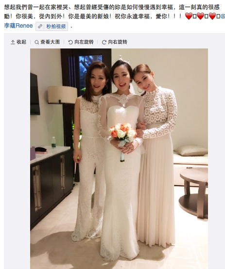 李蘊、超蓮同G.E.M.一向係好姊妹,今次李蘊結婚收得咁密都只有少數人知道。超蓮在相中話:「看著你們開始談戀愛到現在走到結婚步入禮堂實在太替你開心了!」而G.E.M.亦祝福李蘊:「你是最美的新娘!祝你永遠幸福,愛你!」