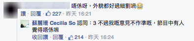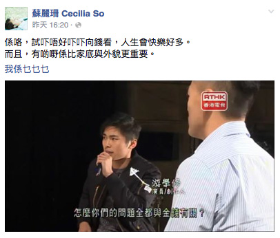 節目令全城批評「港女現實」,而蘇麗珊眼見男友被一眾女生嫌棄兼俾人話外表「太?仔」,出言力撐男友。昨日她在Facebook話:「有啲嘢係比家底與外貌更重要」,明顯表示自己不在乎男友不是有家底之人。當網友們留言話覺得游學修較靚仔時,蘇麗珊亦回覆表示認同,話自己都覺得係,但自己的意見不能作準咁話。