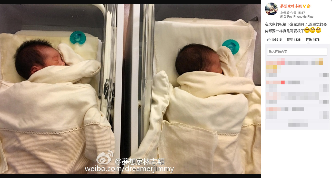【now.com】擁有一副「不老童顏」的台灣男星林志穎,上月初宣布太太生下雙胞胎兒子,變成一家五口,非常幸福。老婆陳若儀生產後都要坐月休養,照顧孖仔的責任都落在林志穎身上,元旦日林志穎更在微博大晒餵奶相。今日是一對孖仔滿月,林志穎在微博晒出孖仔睡覺照片,見到孖仔瞓覺時連睡姿都一模一樣勁Cute,林志穎留言說:「在大家的祝福下,寶寶滿月了,連睡覺的姿勢都要一樣真是可愛極了!」