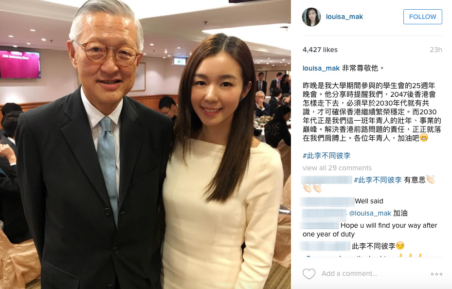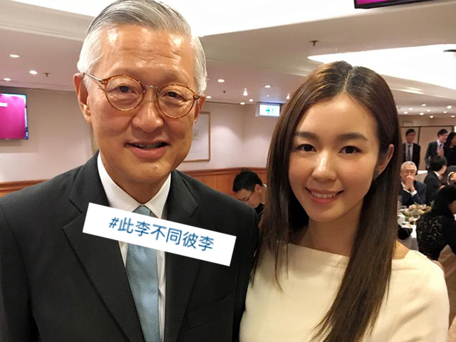 與李國能同樣是劍橋大學法律系畢業的Louisa非常尊敬對方,見到李國能更立刻變成小Fans上前合照。Louisa將合照Post上Facebook:「他(李國能)分享時提醒我們,2047後香港會怎樣走下去,必須早於2030年代就有共識,才可確保香港繼續繁榮穩定。而2030年代正是我們這一班年青人的壯年、事業的巔峰。解決香港前路問題的責任,正正就落在我們肩膊上。各位年青人,加油吧。」而最有意思的是Louisa在句末加了一句「#此李不同彼李」的Hashtag,令網民不禁認為她暗串與李國能是堂兄弟的李國章。
